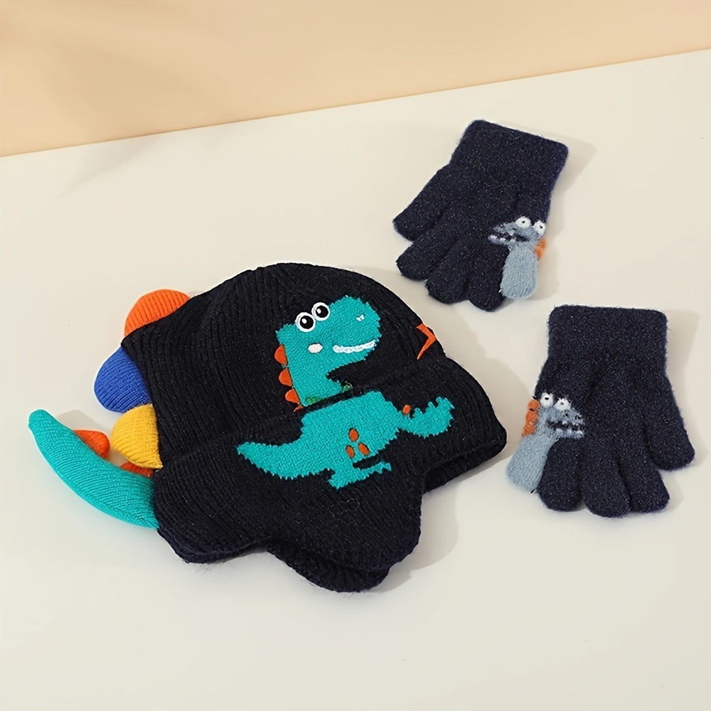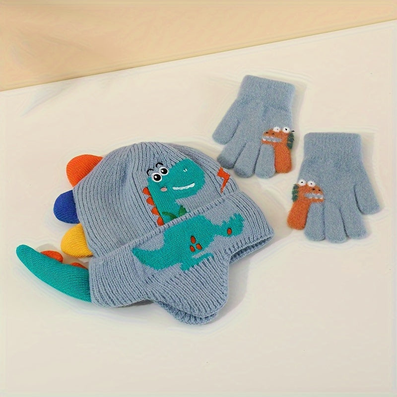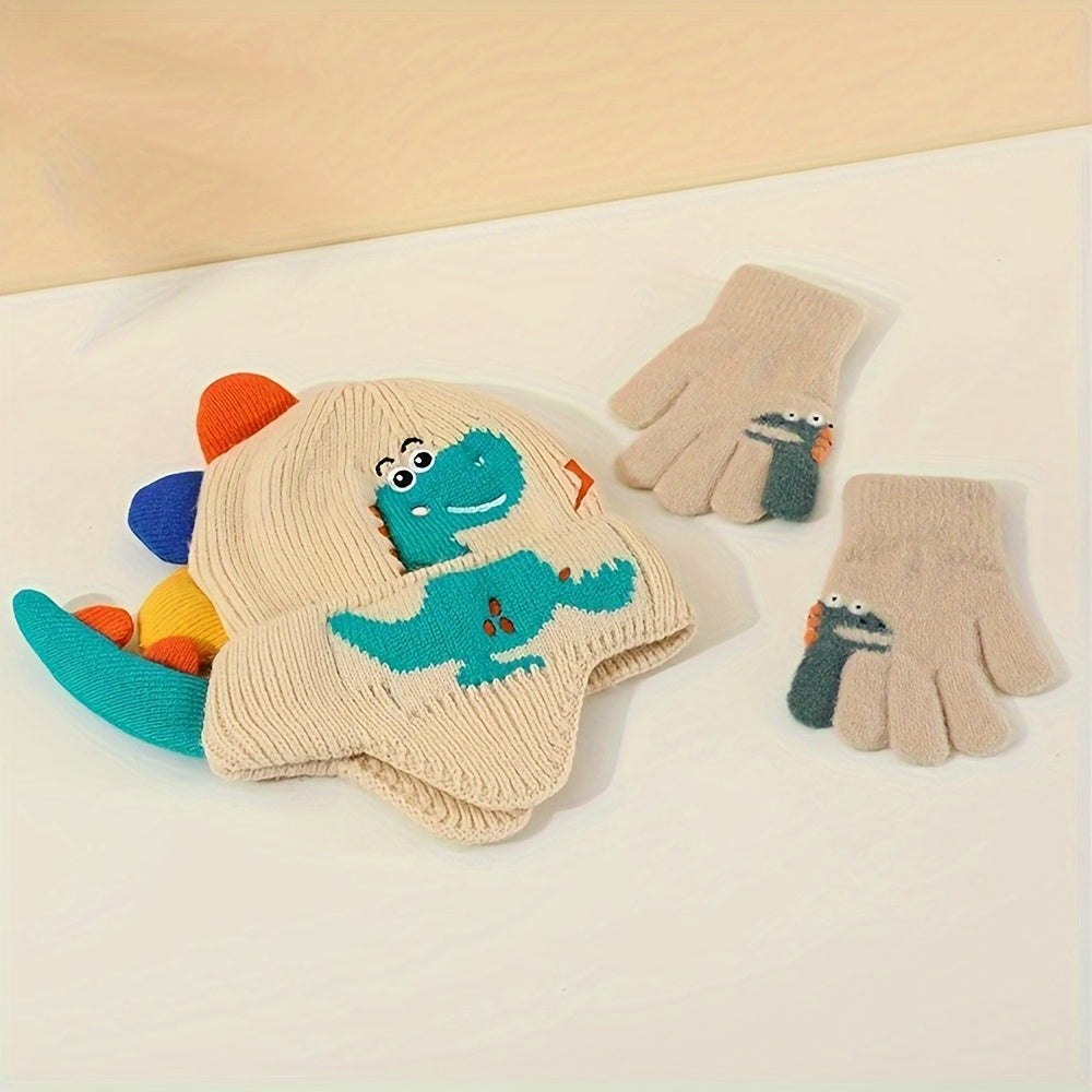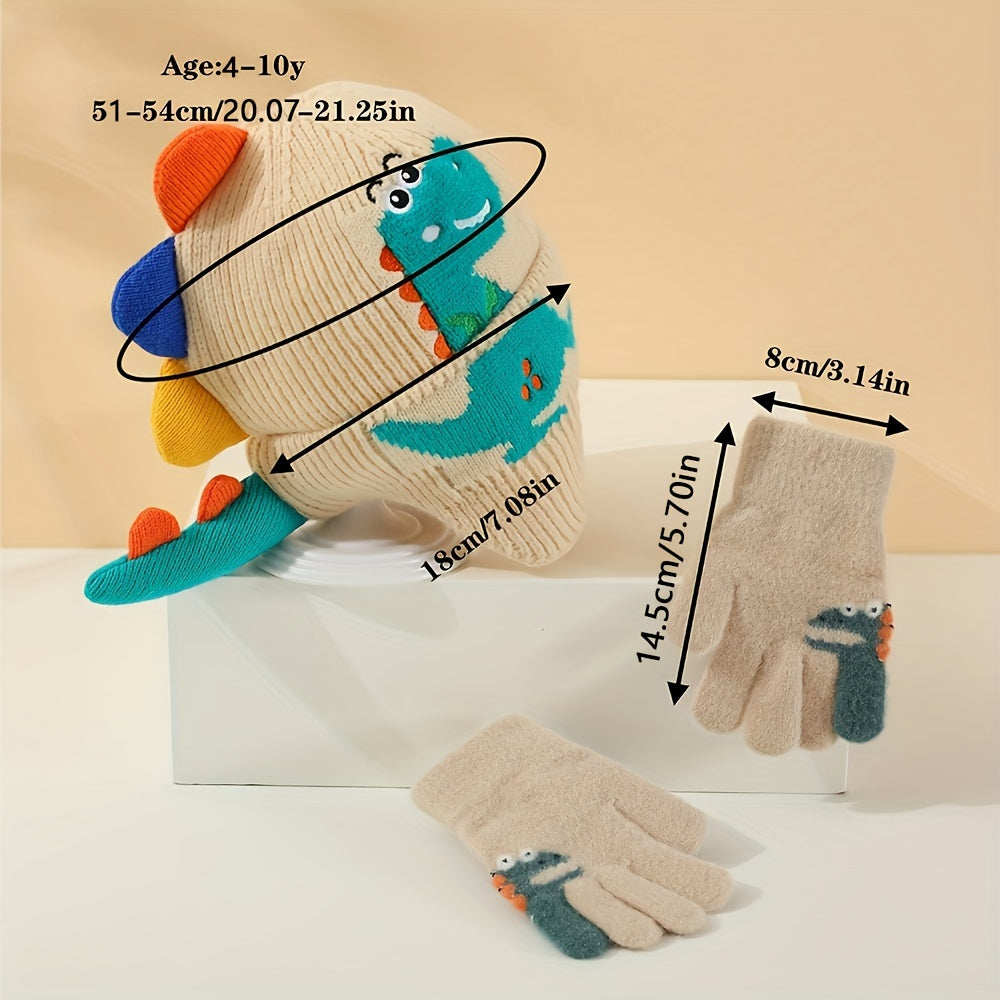 2pcs Cute Dinosaur Ears Warm Hat & Glove Set for Kids - Polyester, Knit Fabric, autumn Winter Essentials, Perfect for Daily Outings & Outdoor Adventures, 4-10 Year Olds, Winter Essentials Playful Design Stretchy Fabric
