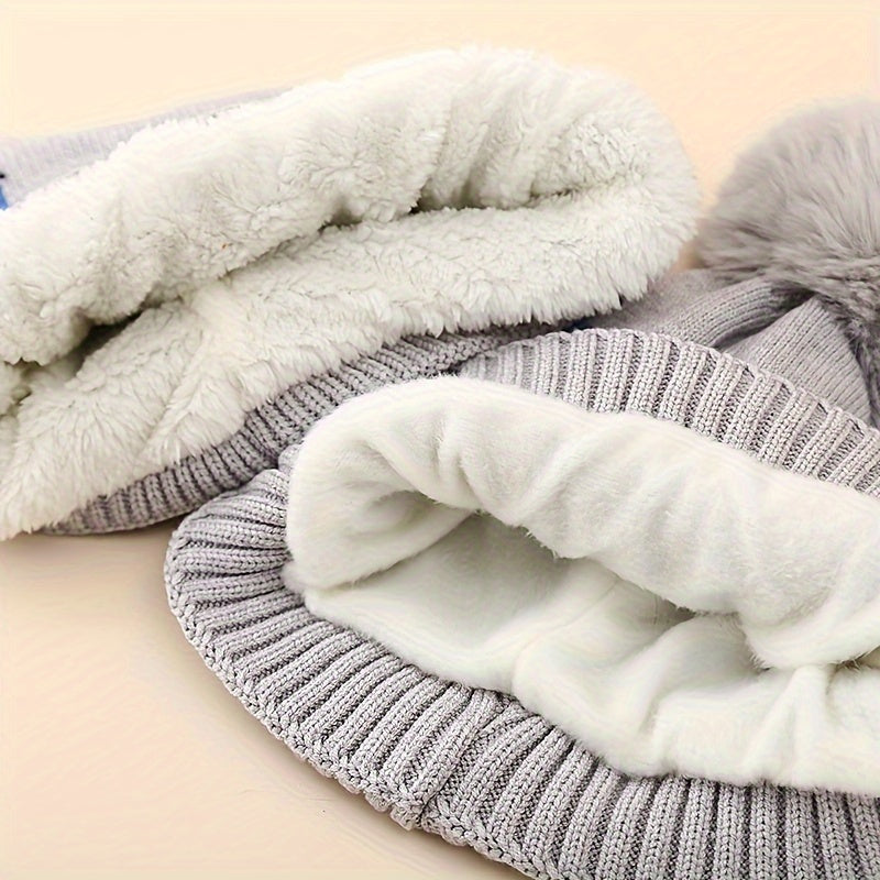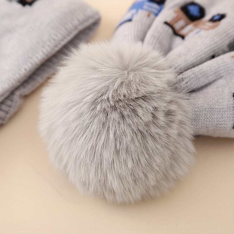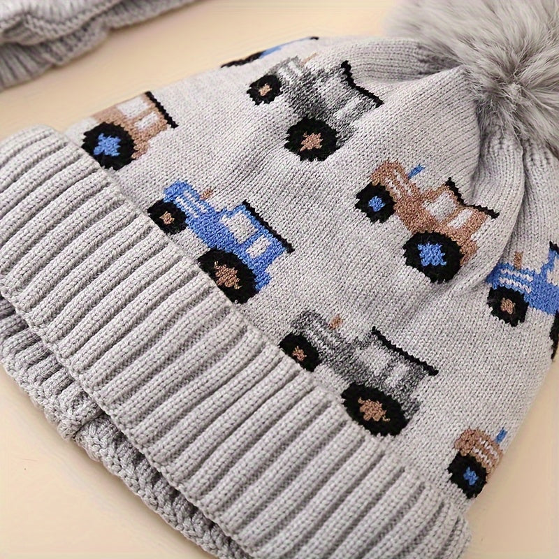 2pcs Set Kids Cartoon Car Jacquard Knit Hat and Scarf, Winter Warmth for Boys Ages 3-8, Acrylic Pom Beanie with Integrated Neck Warmer