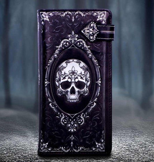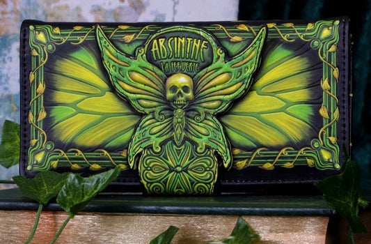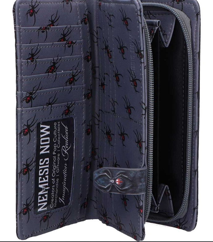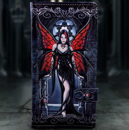 The Aracnafaria embossed purse is a striking accessory featuring the haunting artwork of renowned fantasy artist Anne Stokes. Showcasing the mysterious fairy Aracnafaria, dressed in a flowing black gown with black and red wings inspired by the black widow spider, this purse is perfect for fans of dark fantasy. It features embossed detailing, a black widow spider stud closure, and spider patterns on the interior, all crafted from high-quality faux leather. Packaged in a protective polybag, it's ideal for gifting or collecting. Designed for lovers of gothic fashion and fantasy art, this unique purse adds an elegant edge to your everyday look.