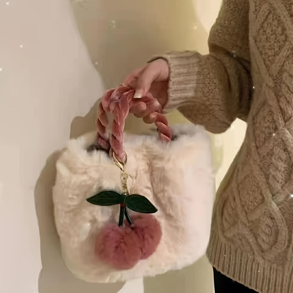 Perfect for chilly days, this Cherry Plush Handbag is a cozy bucket-style crossbody with a fun rabbit-inspired chain detail. Embrace autumn and winter vibes with its soft, cuddly design!