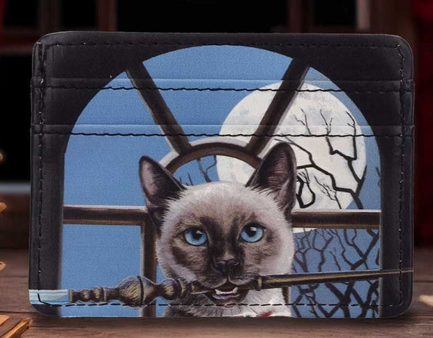 The Hocus Pocus Card Holder is a compact and enchanting accessory featuring magical artwork from Lisa Parker. It showcases a white cat holding a wand in its mouth, seated in front of a window with a glowing full moon and night sky behind it. The design is mirrored on both sides, and the interior includes multiple card slots for everyday convenience. Packaged in an attractive gift box, it’s perfect for gifting or personal use. Ideal for cat lovers, fantasy fans, and those drawn to mystical themes, this card holder brings a little everyday magic to your pocket.