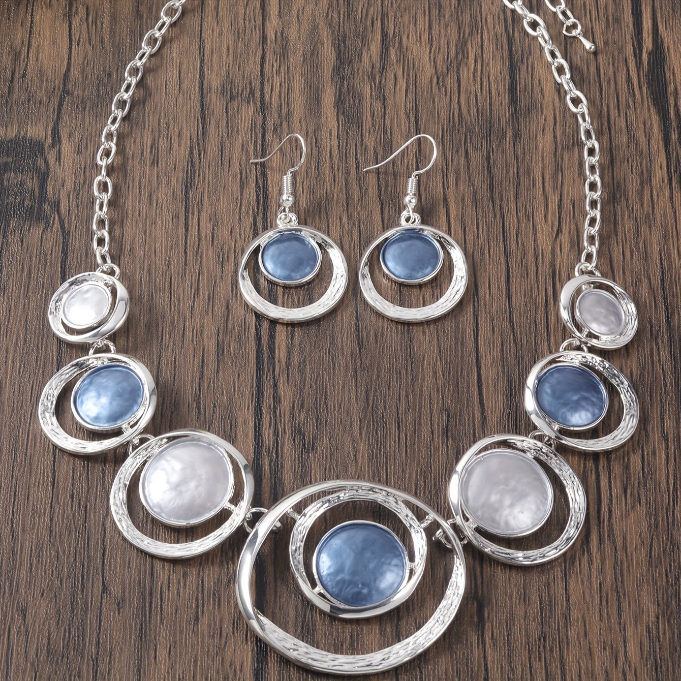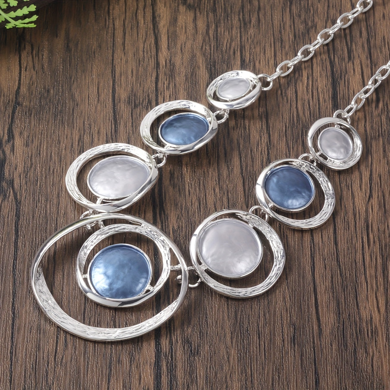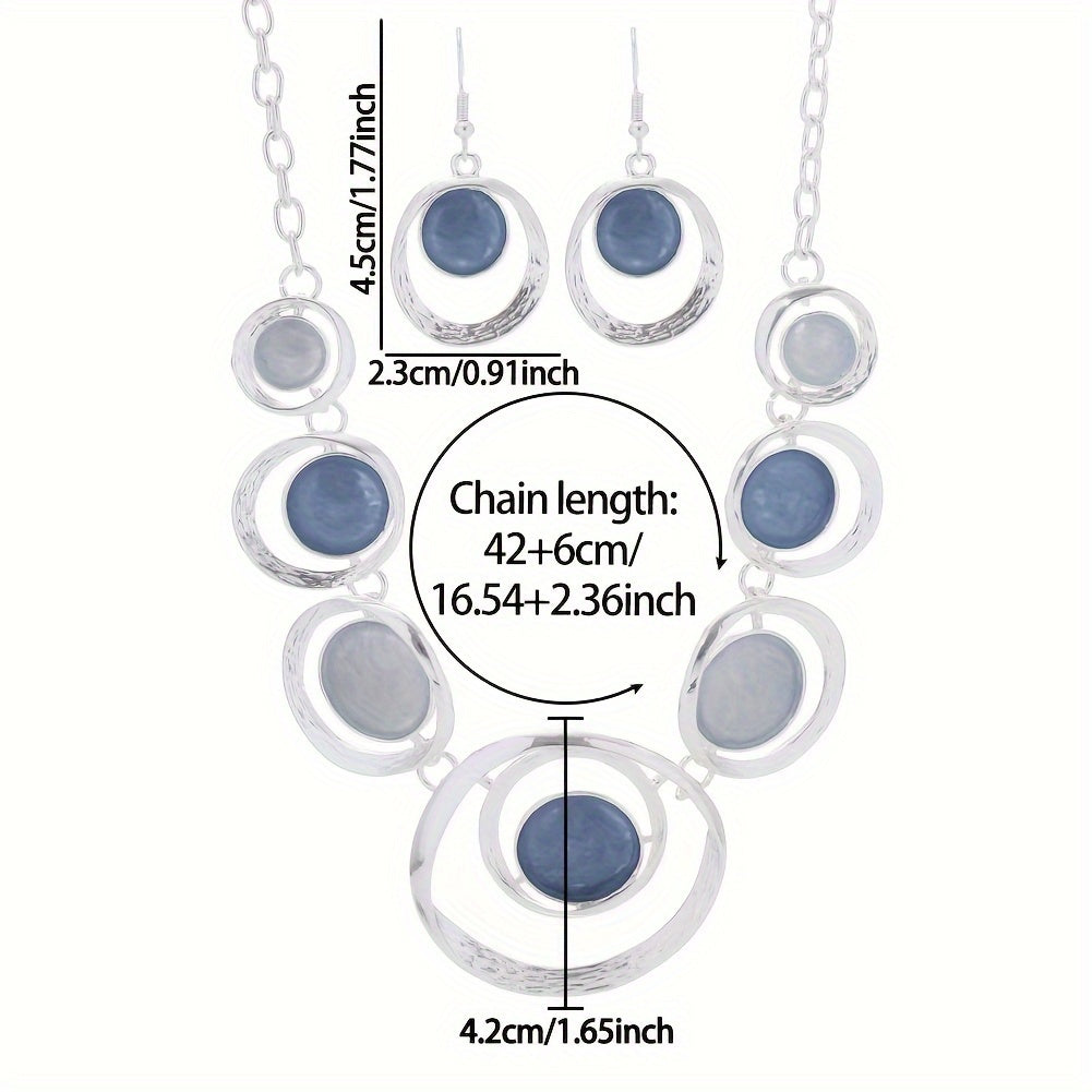 This trendy women's necklace and earring set features stylish concentric circles crafted from zinc alloy. Perfect for adding a splash of personality to your daily look or a special banquet, these chic accessories come in playful shades of light green and light blue. Original design meets retro charm for a gift that's both fun and unique.