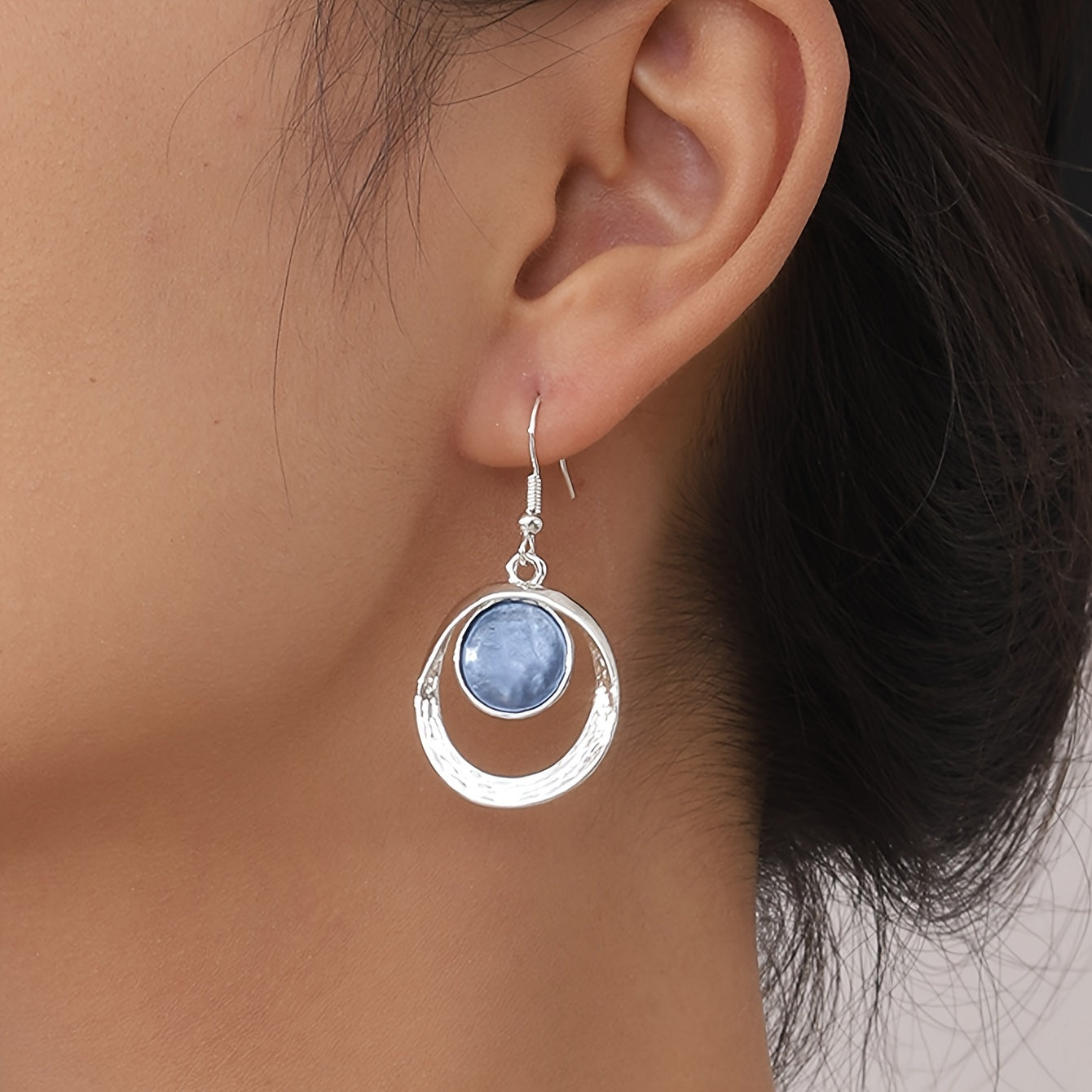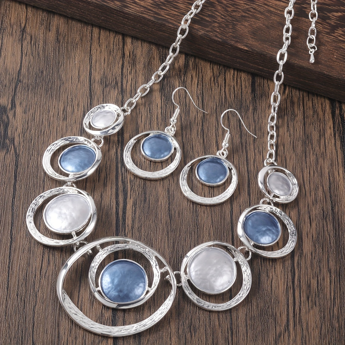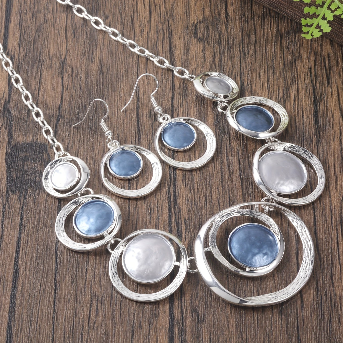 This trendy women's necklace and earring set features stylish concentric circles crafted from zinc alloy. Perfect for adding a splash of personality to your daily look or a special banquet, these chic accessories come in playful shades of light green and light blue. Original design meets retro charm for a gift that's both fun and unique.