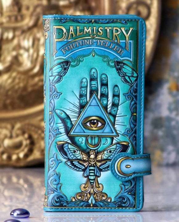 This stunning Palmistry Embossed Purse features the Palmistry Fortune Teller. Designed with precise detailing, stunning colours of aqua blue and metallic gold, the front of the wallet shows a symbolic palm with the Eye of Providence and a skull butterfly. This beautiful wallet is sure to keep all your cash safe!