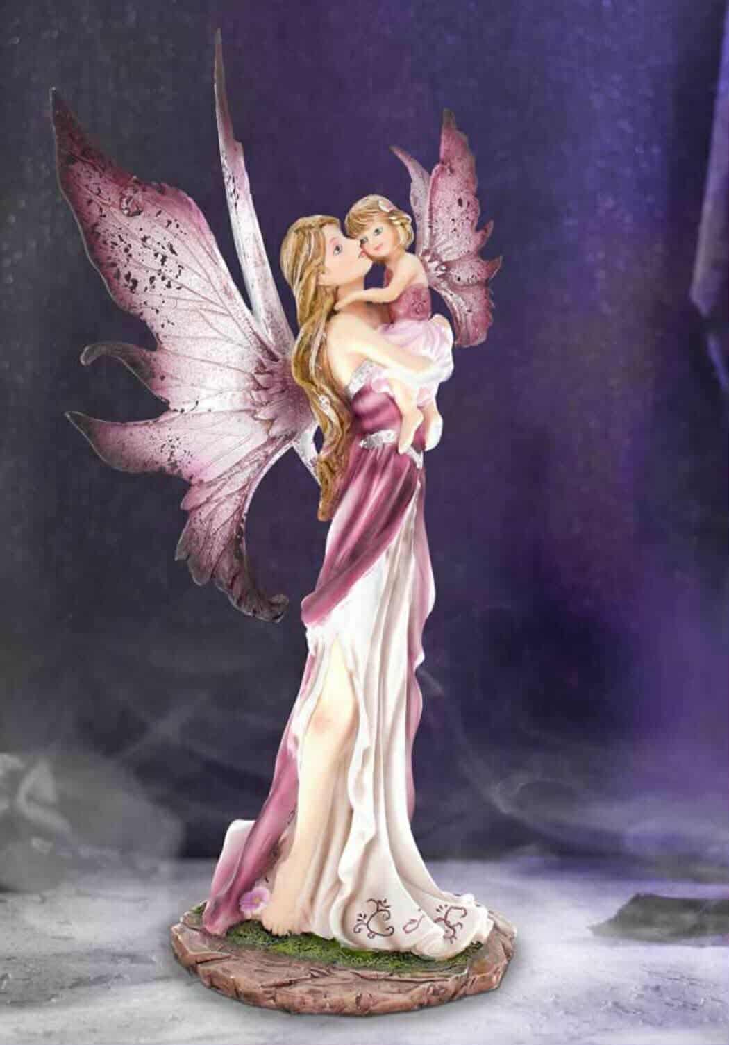 Standing on the ground, this Fairy matriarch cradles her small fae child to her face. Both wearing flowing fuchsia dresses, the make the most adorable pair. The mother's light hair flows over her tiny frame, while her large purple ombre wings take centre stage. Cast in the finest resin before being hand-painted, this figure is perfect for anyone who seeks to find magic in everyday life.