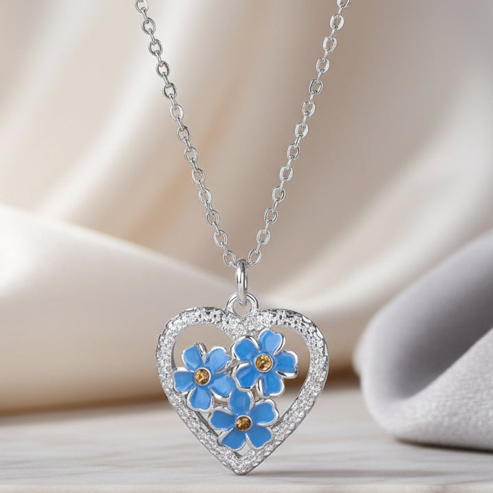 Plated with real silver, this delicate yet stylish necklace showcases a trio of pretty forget-me-nots inside a heart pendant. The flowers are adorned with beautiful blue petals and amber crystals that glint in the centre of each flower. The sparkly heart pendant hangs in the centre of the dainty silver link chain when you wear it. The chain is 45cm in length and features a lobster claw clasp, with extender chain allowing you to choose your desired length.