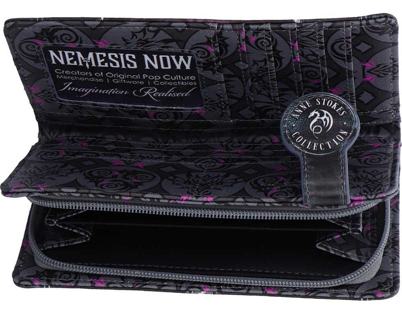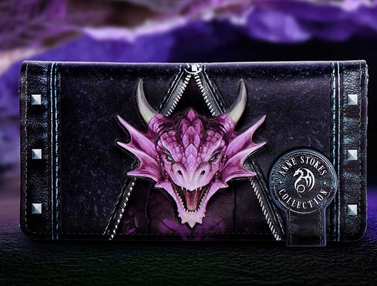 The Unzipped Dragon Embossed Purse is a bold and mystical accessory featuring Anne Stokes' fantasy artwork of a pink dragon emerging through a zip, creating a dramatic illusion. Decorated with detailed dragon and pentagram motifs, this spacious purse includes multiple slots for cards, coins, and notes, secured with an easy-press stud closure. Packaged in a sleek, branded gift box, it is perfect for gifting or collecting. Ideal for fantasy fans, Anne Stokes collectors, and lovers of alternative fashion, this purse adds a fierce touch of magic to your everyday style.