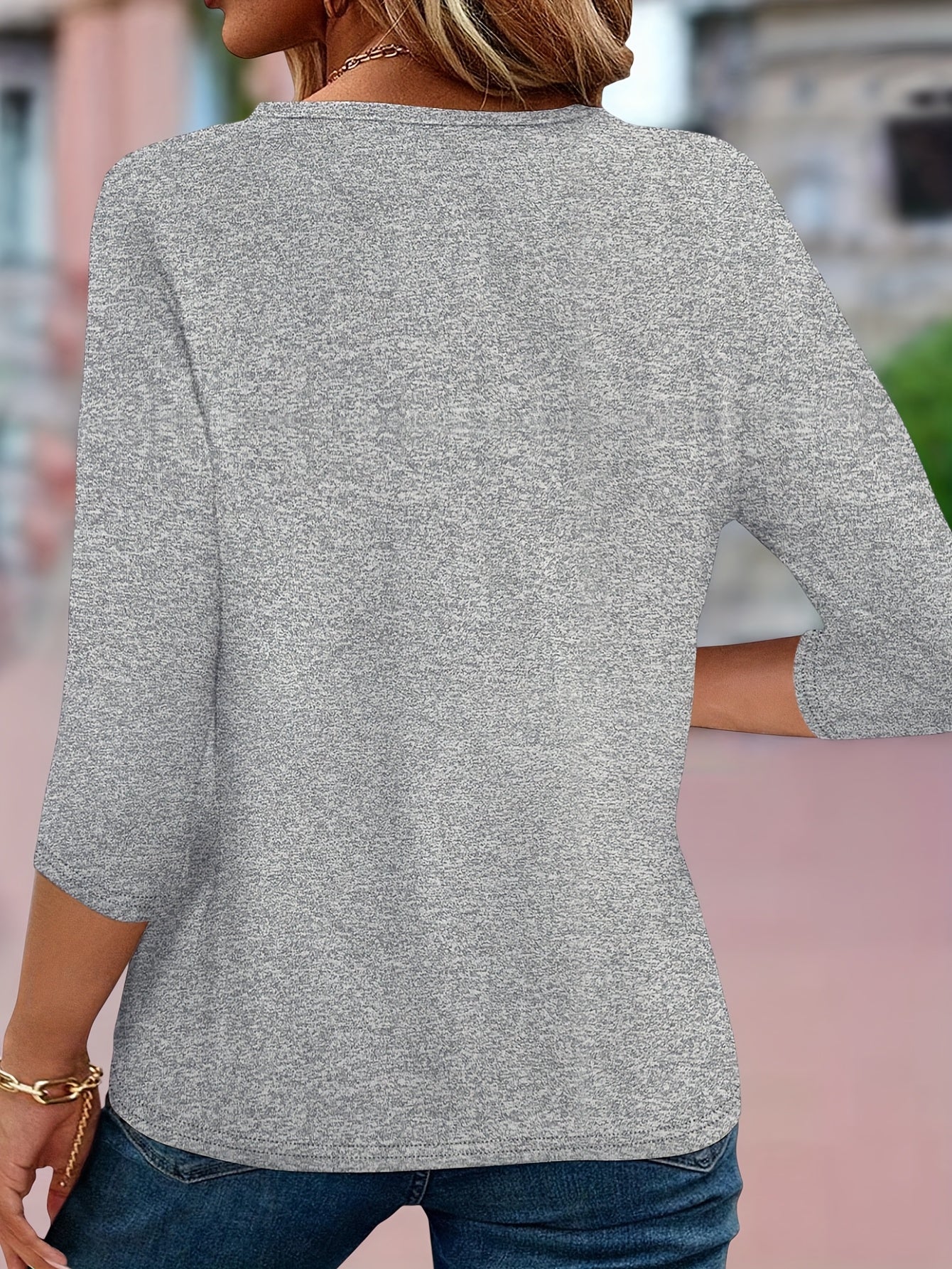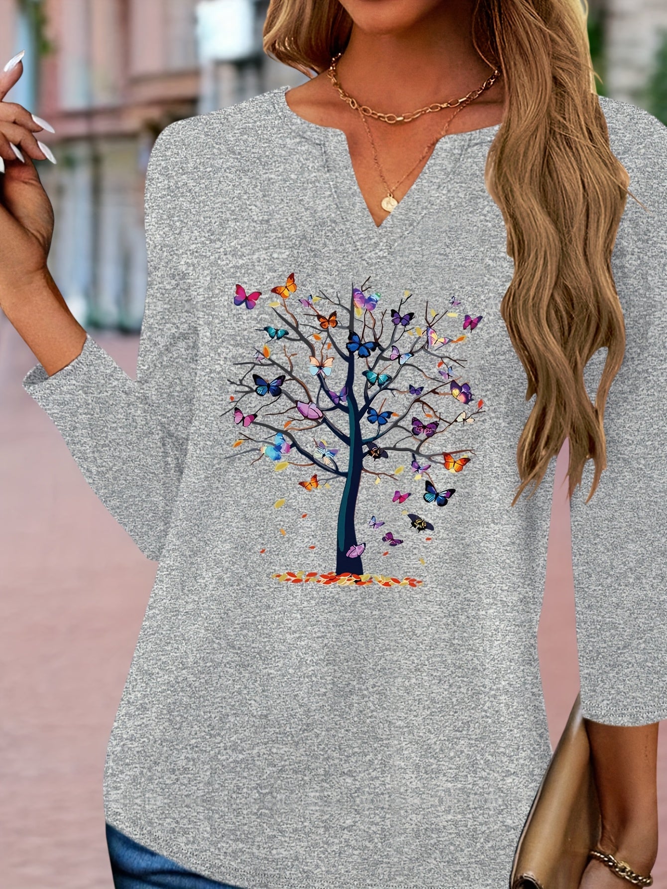 This playful women's tee features a charming butterfly tree graphic with a flattering V-neck and breezy three-quarter sleeves. Made from soft stretch fabric, it offers a relaxed fit perfect for spring and fall. Easy to care for and ideal for casual days, this artistic print top adds a fun touch to your seasonal wardrobe.